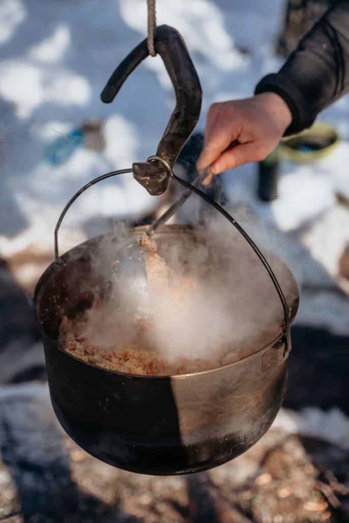 - In this course, we will all pitch in together, whether it’s cooking, transporting equipment, keeping watch over the fire, collecting wood, or melting snow. Especially in winter, it’s important that we work together as a team, not least because it keeps us all warm.
